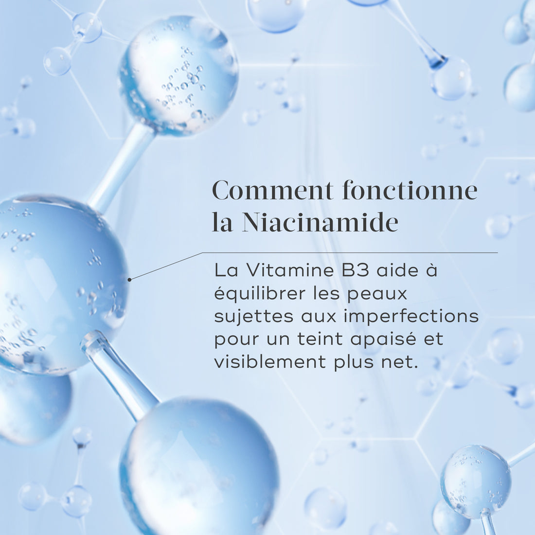 Niacinamide, also known as vitamin B3, is a multifunctional ingredient offering an array of skin benefits. By calming signs of irritation such as redness, it soothes and reduces visible congestion, while also balancing excess oil to support future skin clarity. At the same time, it strengthens your skin’s natural barrier by boosting protective lipids which lock in moisture. Niacinamide also helps to reduce the appearance of dark spots, for a brighter, more even complexion.