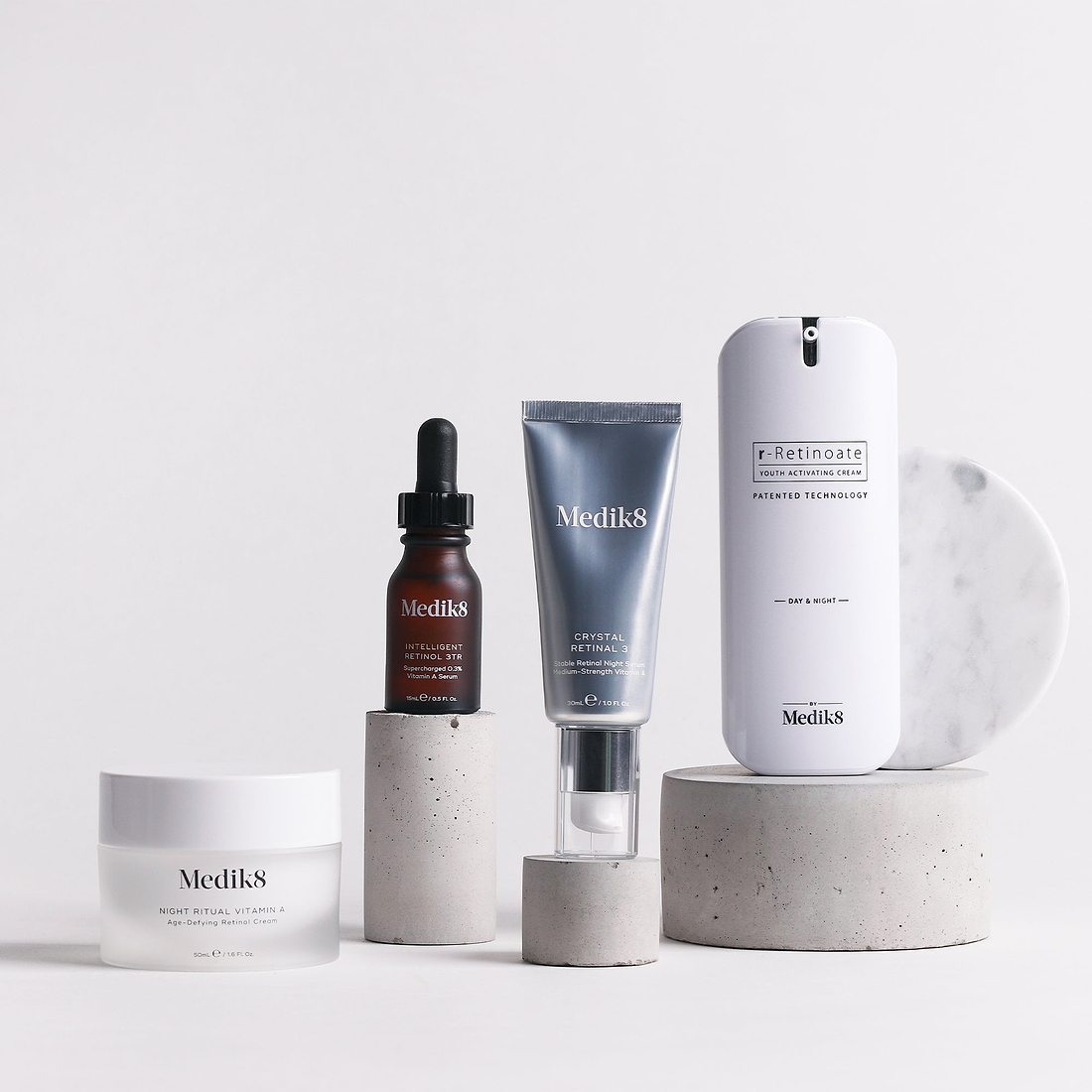 ‘Rétinoïdes«Est le terme parapluie pour tous vitamine A molécules sous leurs différentes formes (y compris le rétinol et la rétinction). Ils sont populaires pour leurs propriétés défiant l'âge, et ils fonctionnent en augmentant la production de collagène et la régénération des cellules cutanées qui aide à lisser l'apparence des ridules et des rides, du teint et de la texture inégaux tout en aidant à s'estomper visiblement des taches sombres pour un teint plus uniforme et plus jeune. Chez Medik8, nous travaillons avec 3 types principaux de vitamine A; rétinol, rétinaldéhyde (rétinction) et rétiny rétiny.
